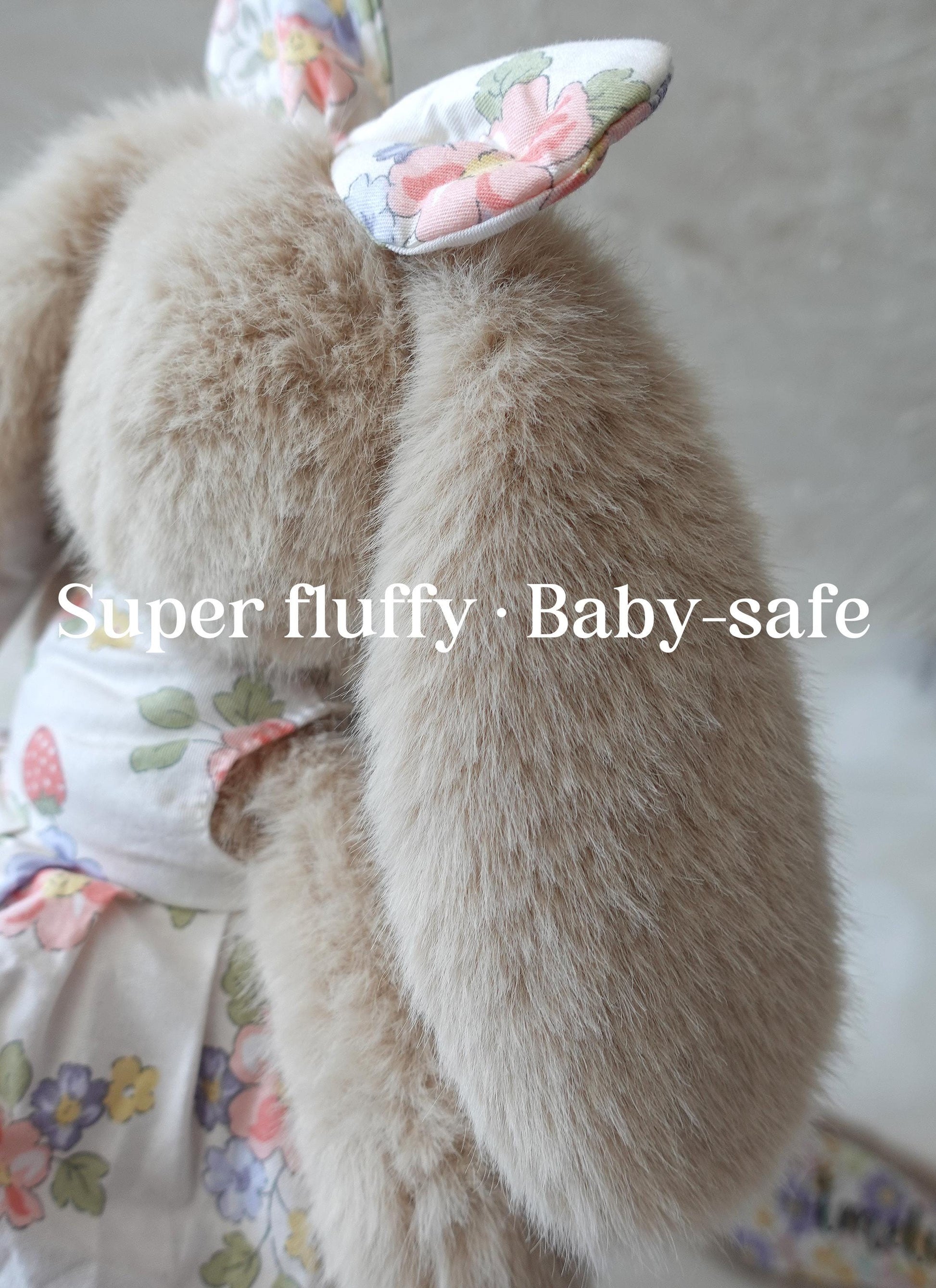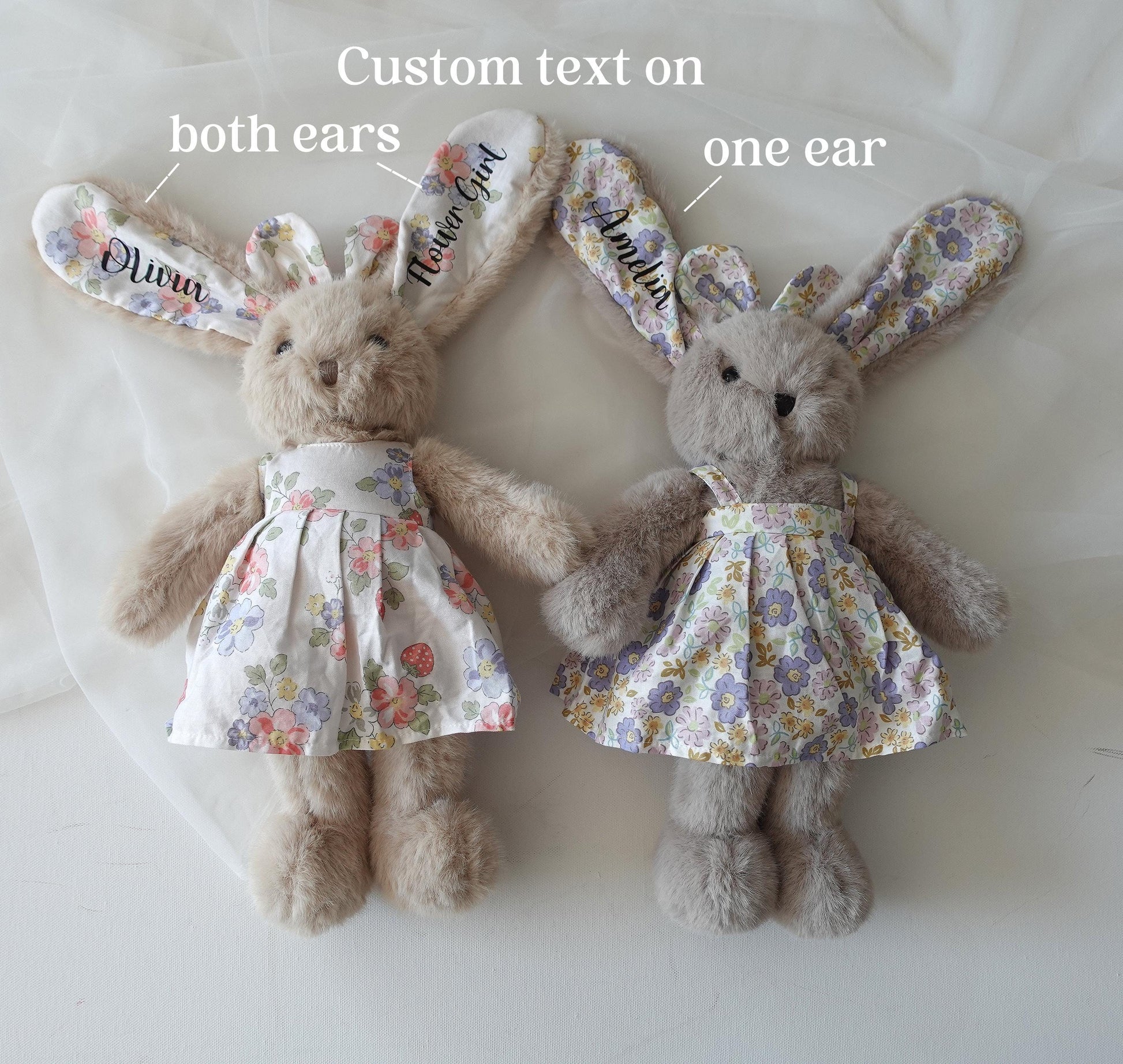 A beautifully crafted personalised bunny plush, designed with a soft vintage feel and dressed in a delicate floral outfit.