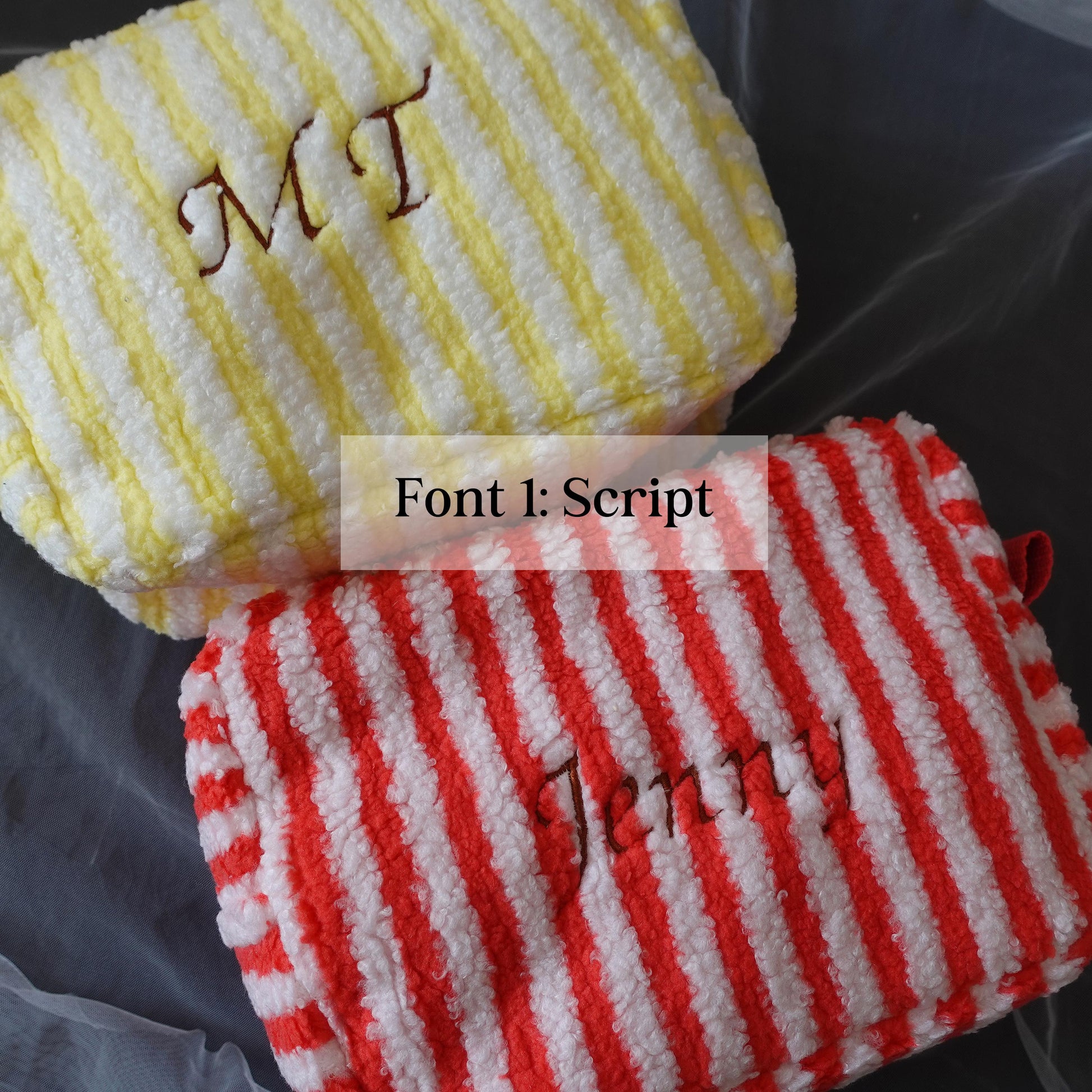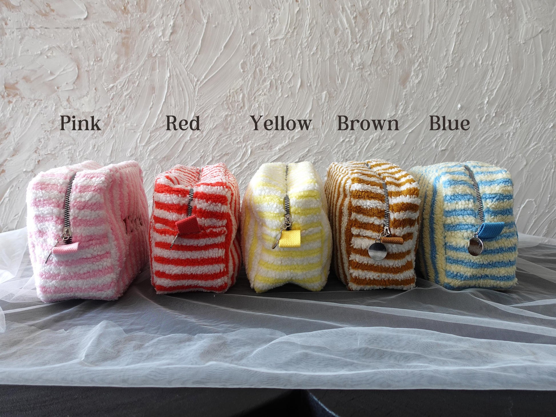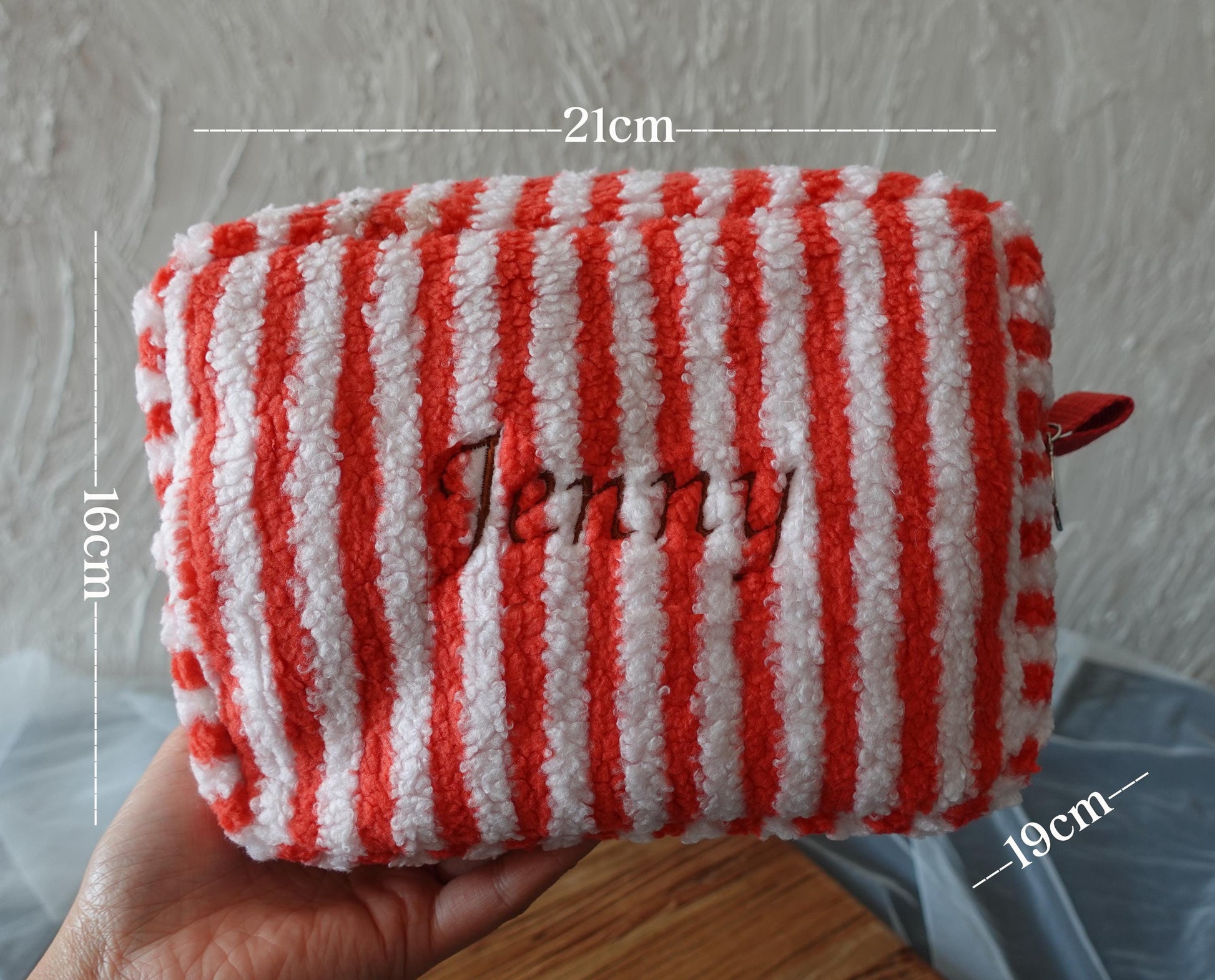 This personalised fluffy striped makeup bag is made with a soft, plush fabric that feels cozy, comforting, and cloud-soft to the touch.