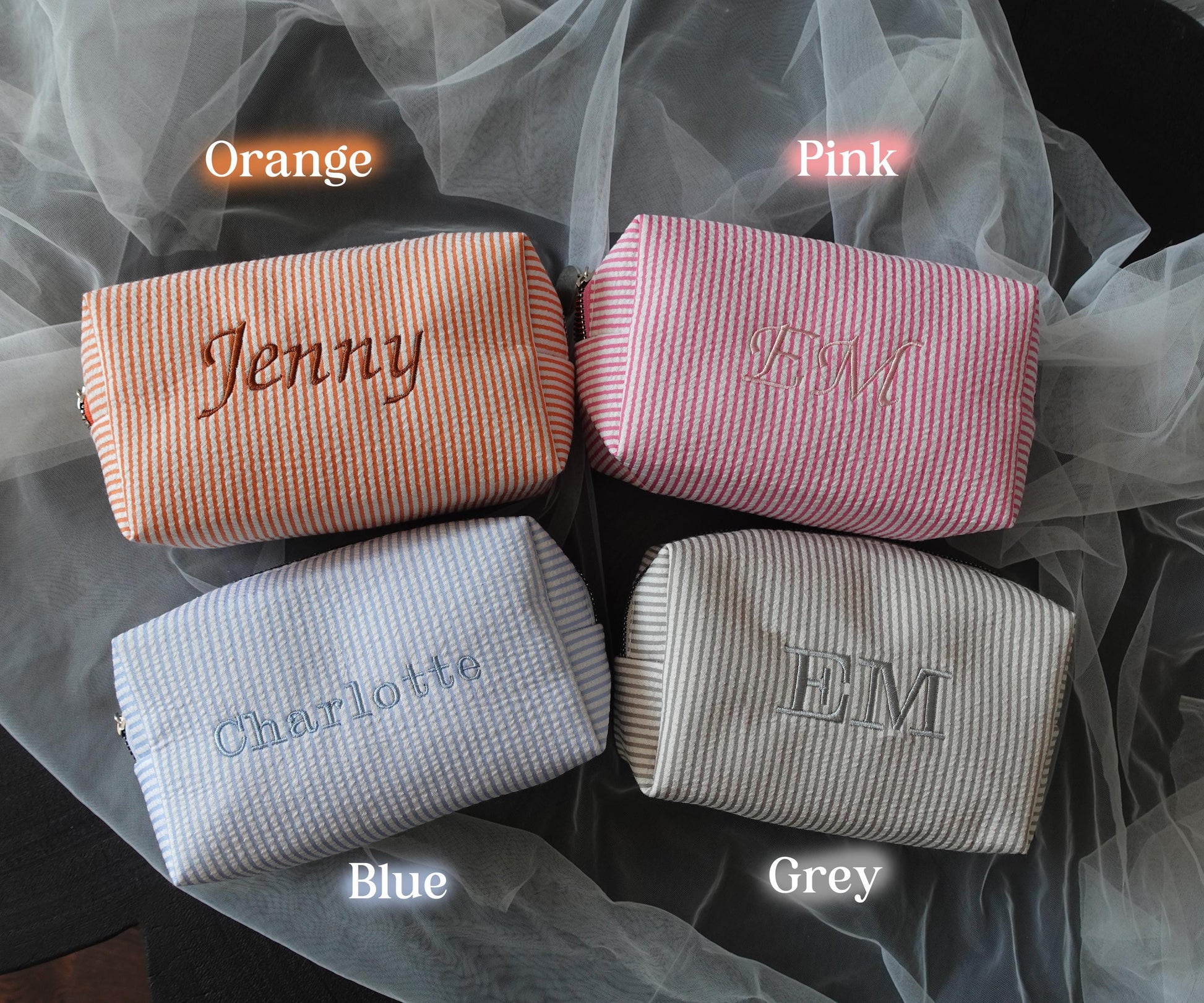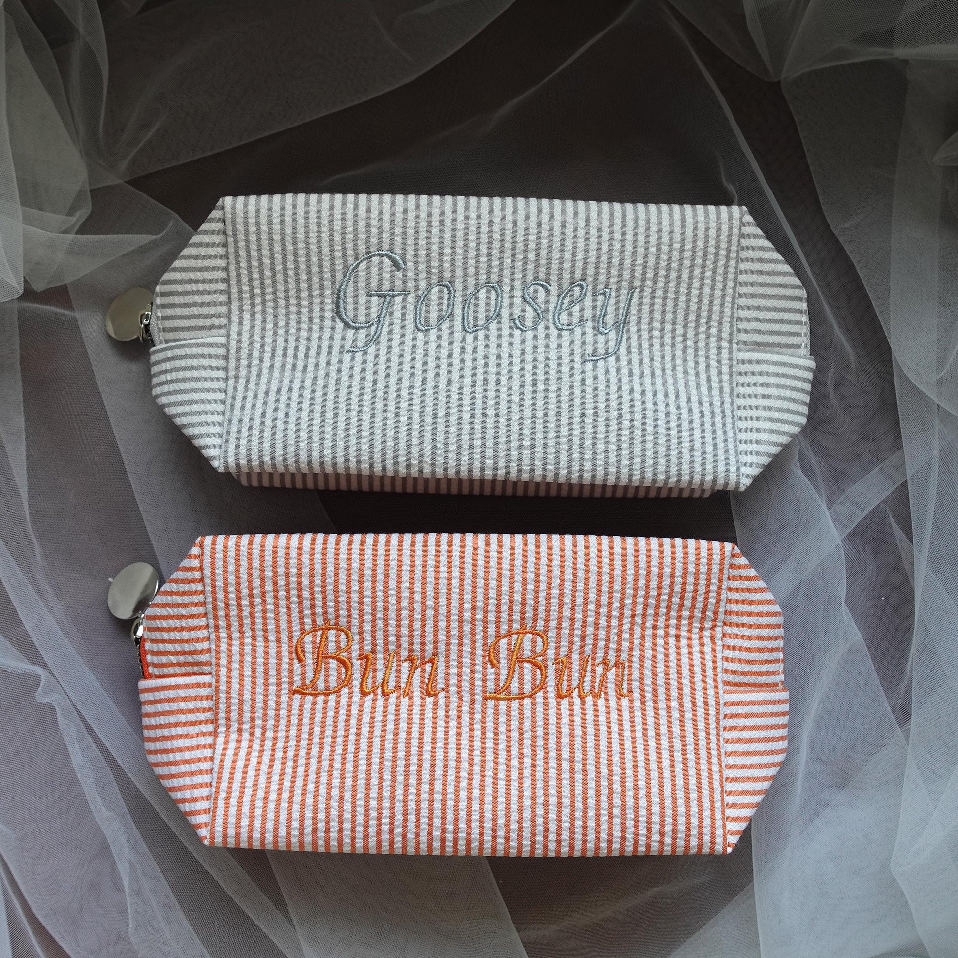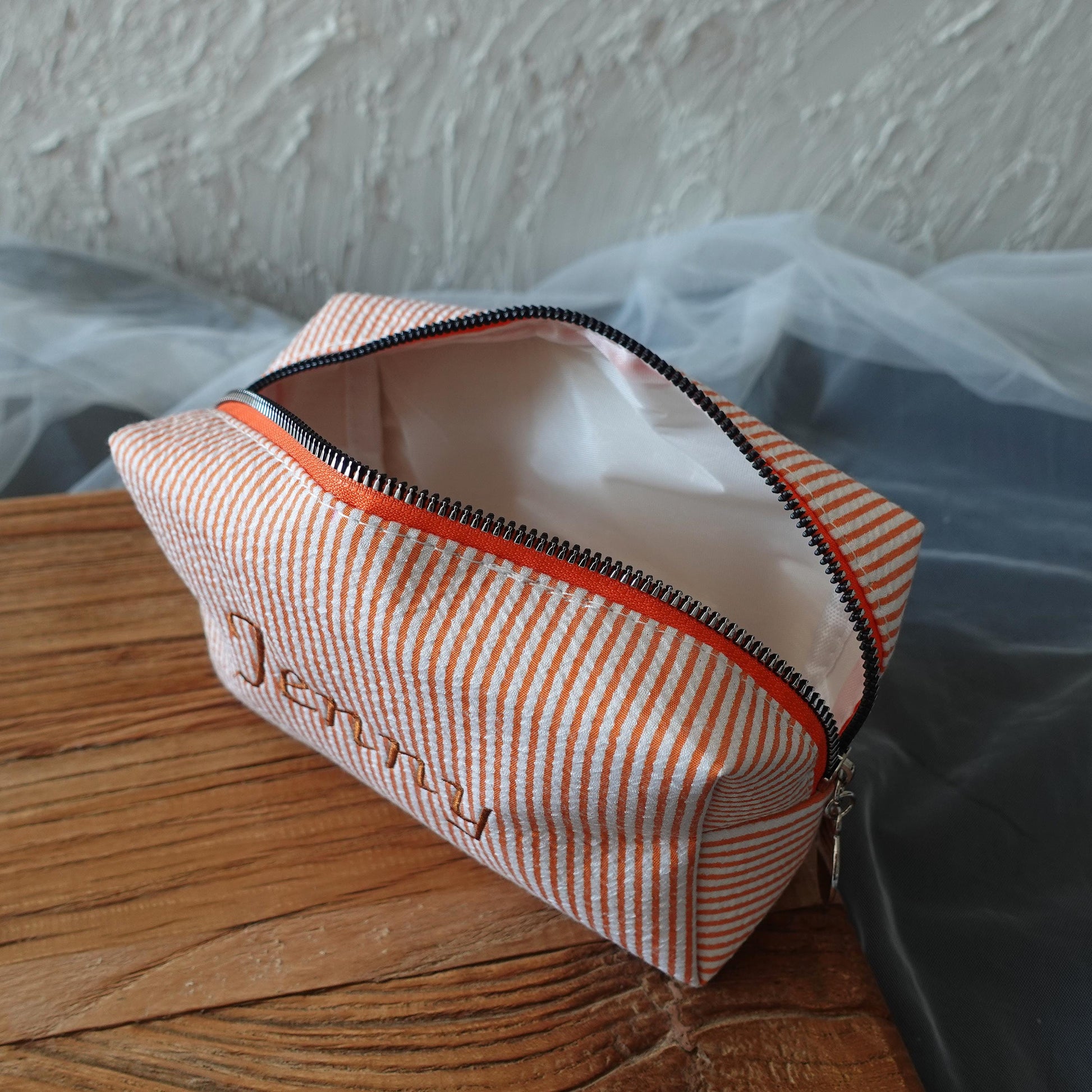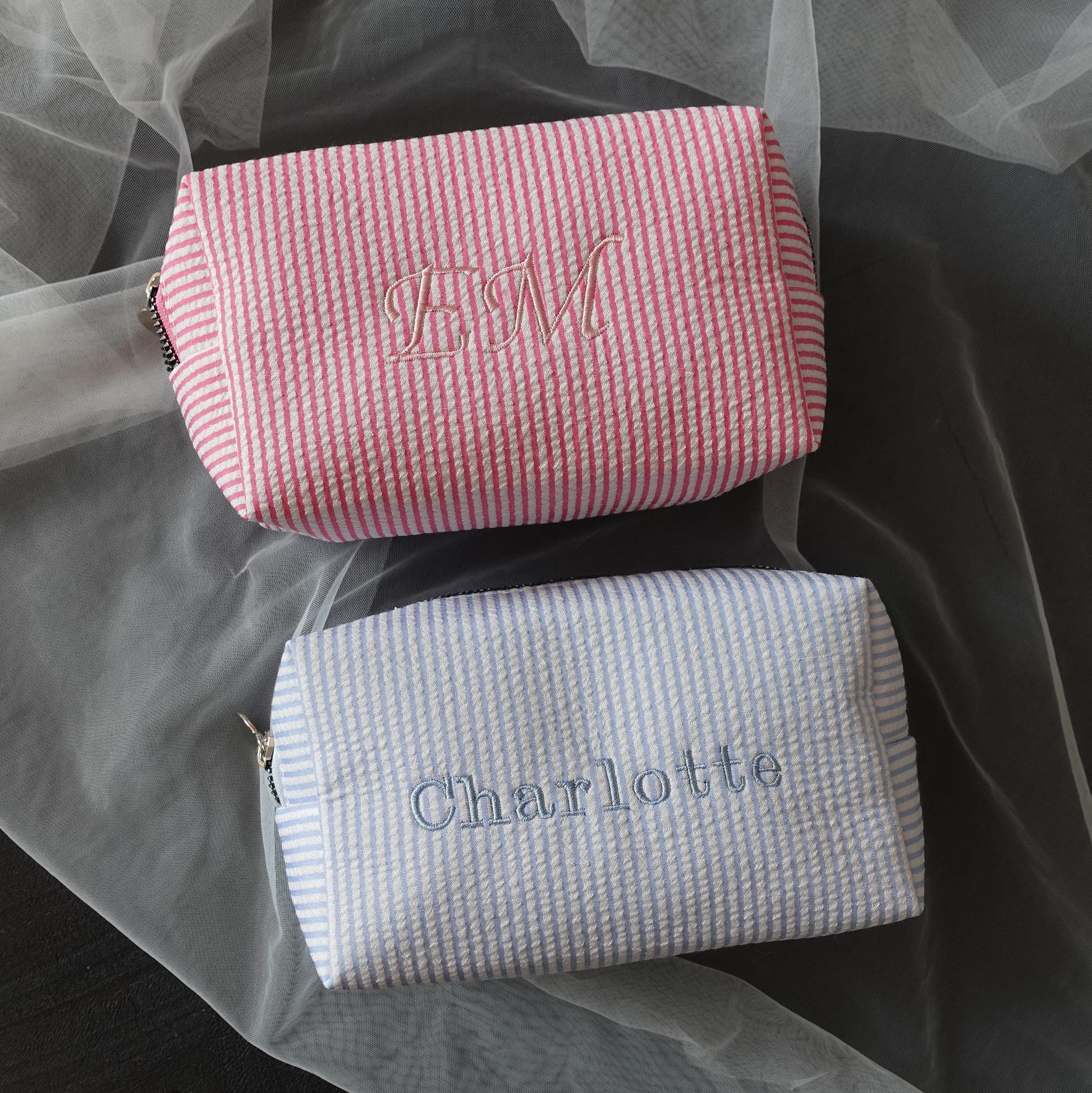 This personalised striped makeup bag is designed in a classic seersucker-style fabric, inspired by vintage summer stripes and soft, relaxed aesthetics.